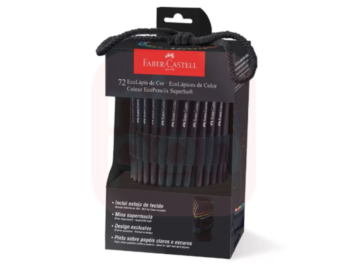 Lançamento da Faber-Castell SuperSoft com 72 cores, incluindo 6 Neon e 6 Metálicas, em um exclusivo estojo de tecido. Ideal para manter seus Ecolápis organizados e protegidos. O Ecolápis foi desenvolvido com o objetivo de cores mais vivas e dispões de excelente cobertura sobre papéis claros e escuros.